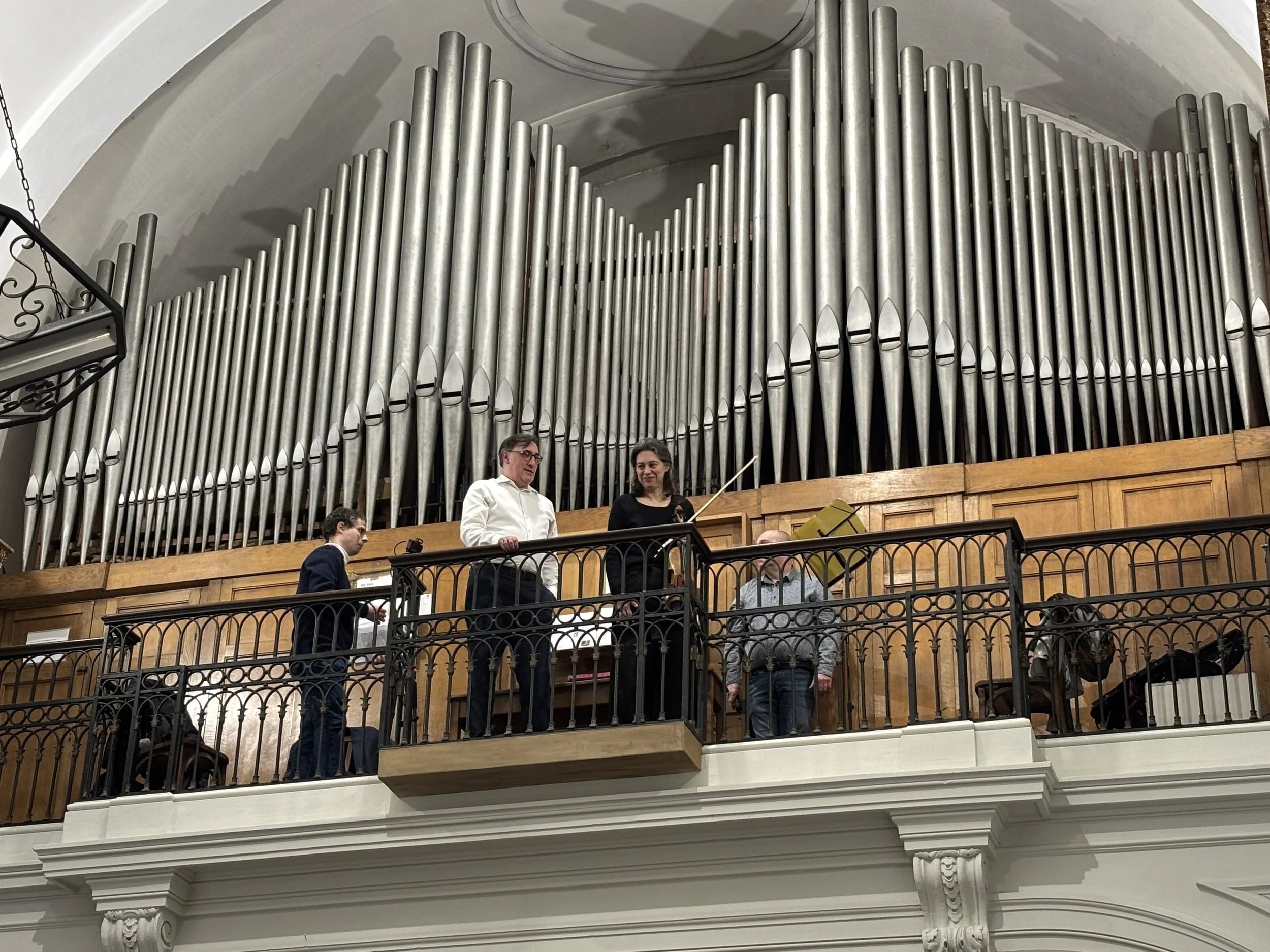 Quatre personnes sur une plateforme devant un grand orgue en métal dans une salle de concert.
