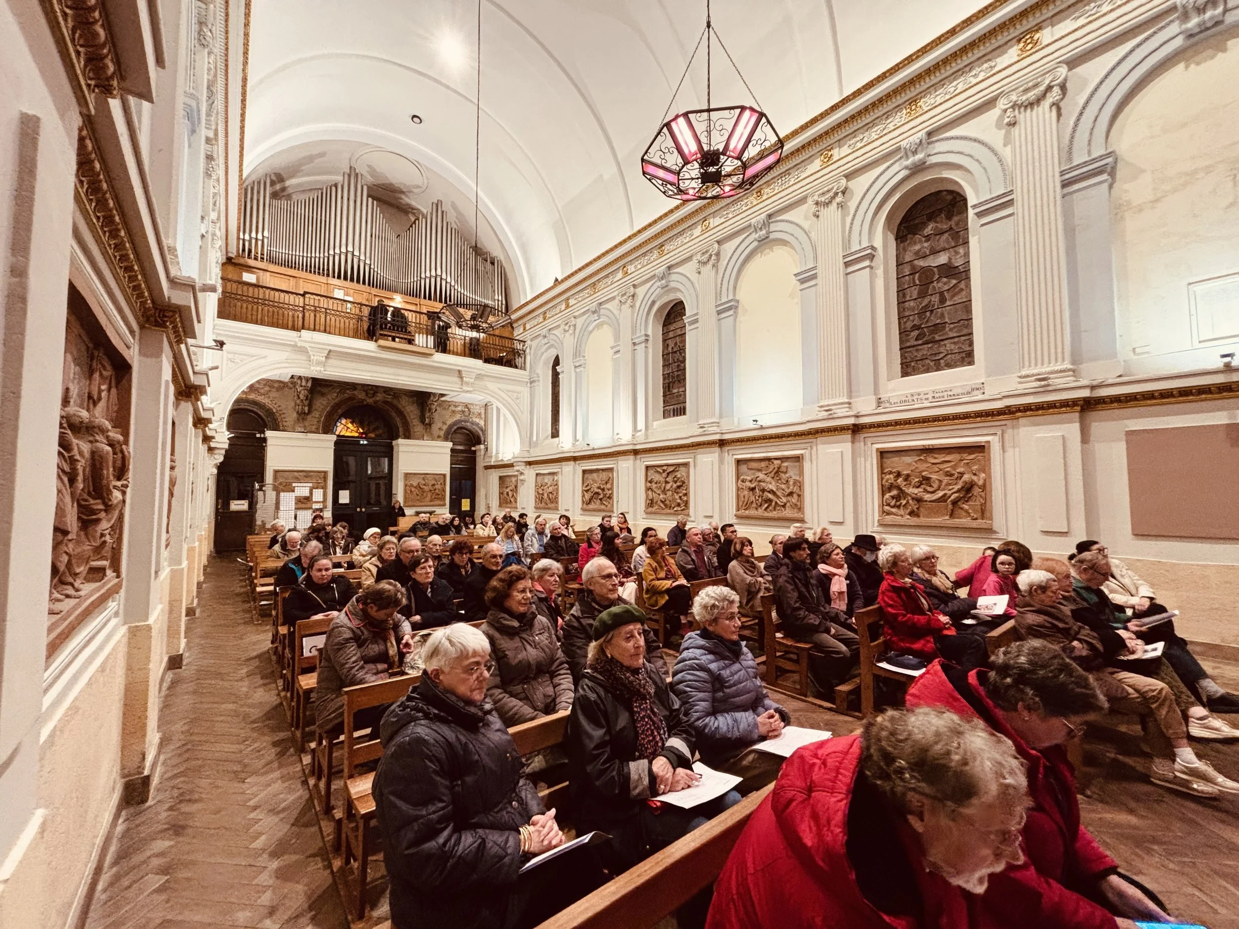 Une salle de concert ou de conférence remplie de personnes assises sur des chaises en bois, dans une salle ornée avec des murs décorés de bas-reliefs en terre cuite, un plafond voûté et un lustre suspendu au plafond.