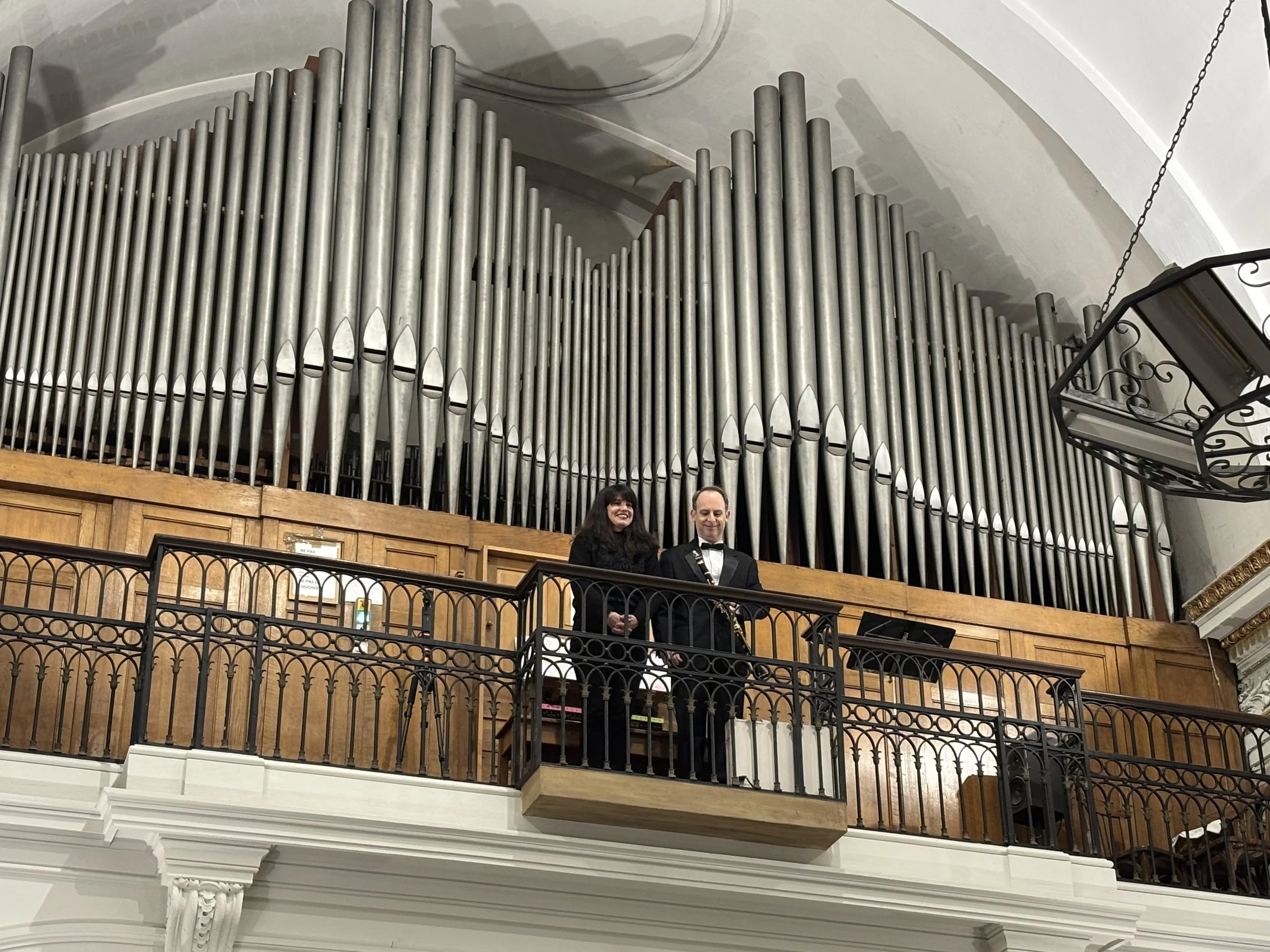 Deux musiciens habillés en noir et blanc, une femme avec des cheveux longs et un homme en costume avec une couronne en album, se tiennent sur une petite plateforme en bois devant un grand orgue à tuyaux en métal dans une salle de concert élégante.