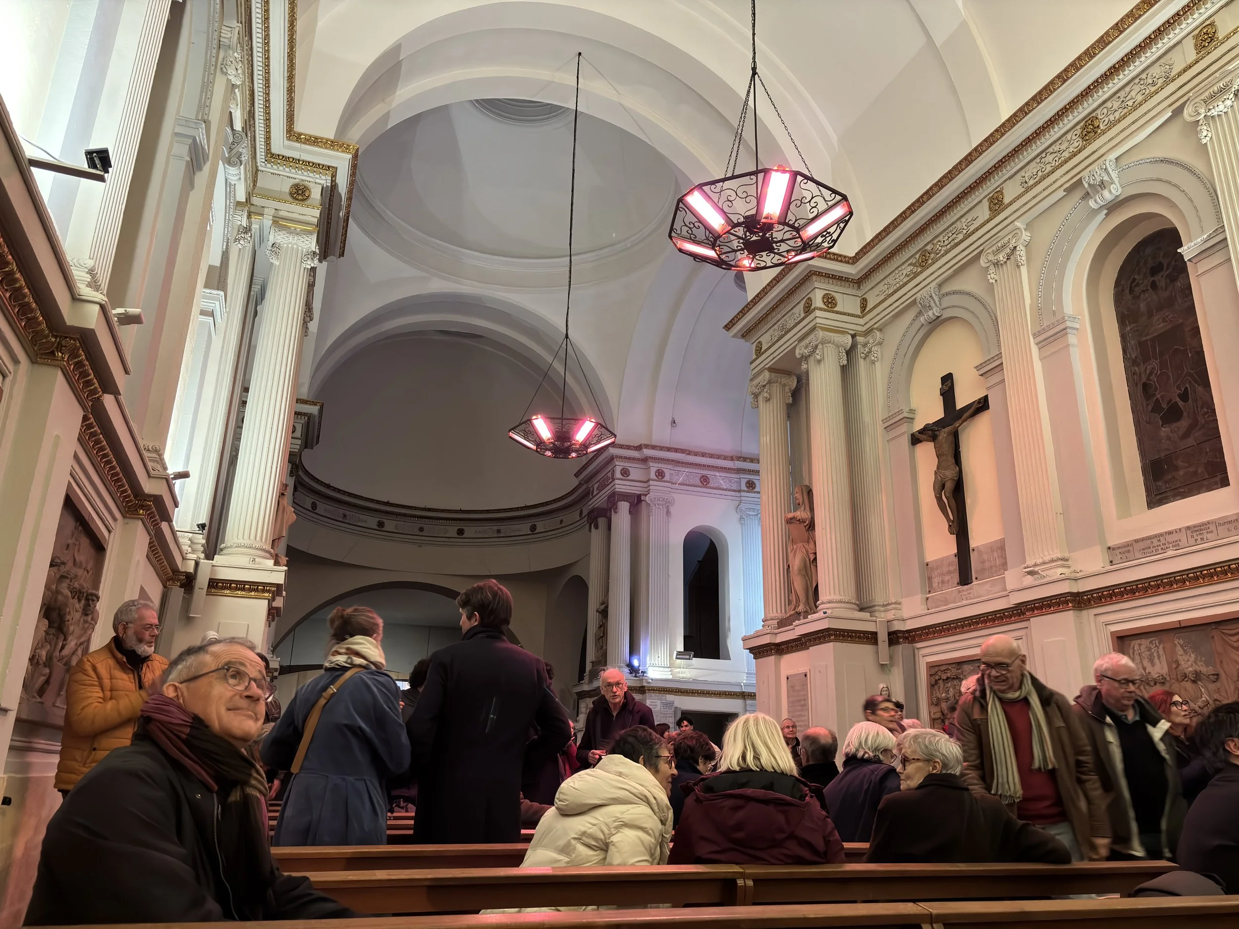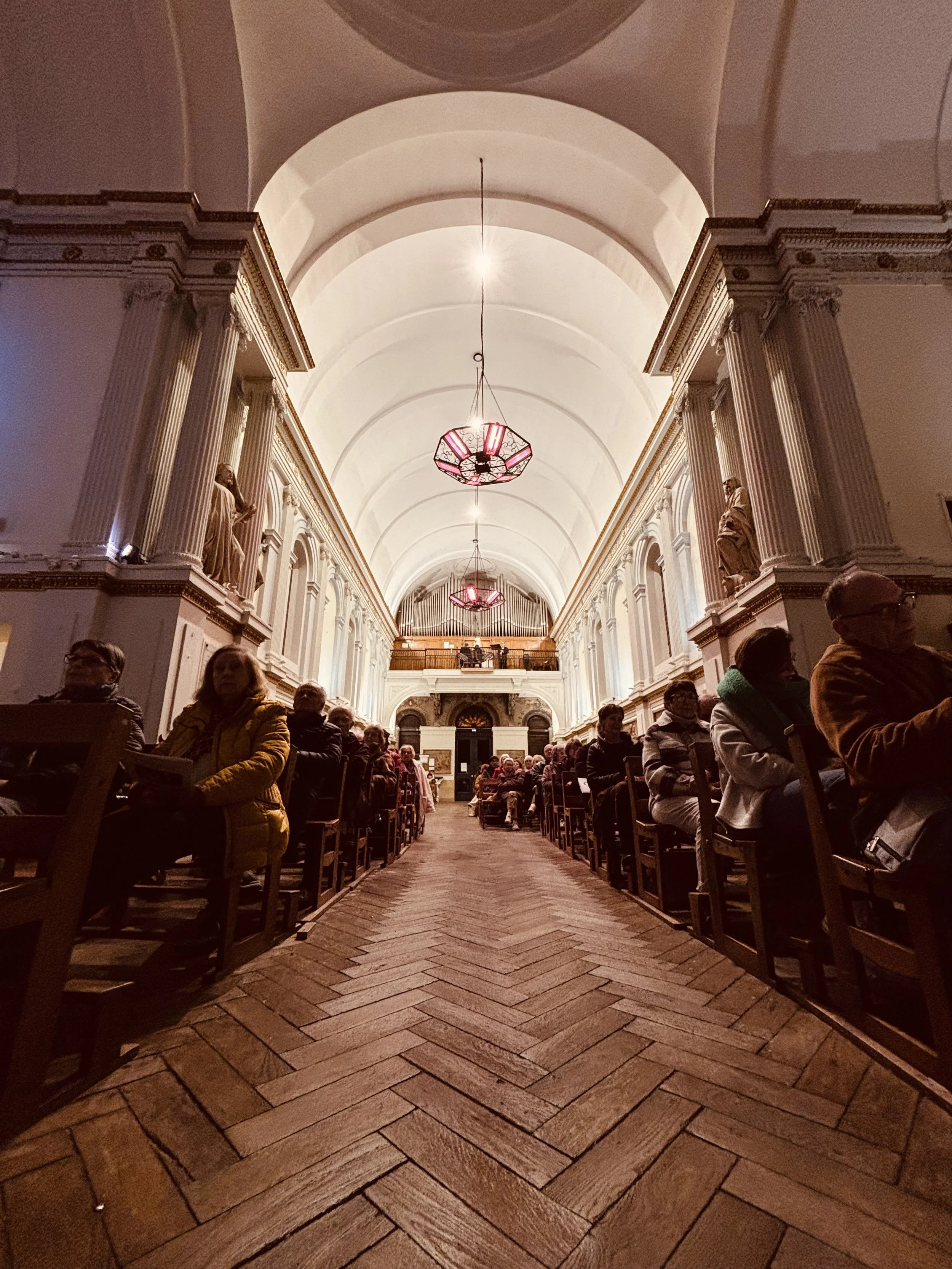Une vue intérieure d'une église ou d'une salle de concert avec une haute voûte blanche, des colonnes ornées et des statues. Des chandeliers rouges pendent du plafond, et un groupe de personnes assises dans des bancs en bois.