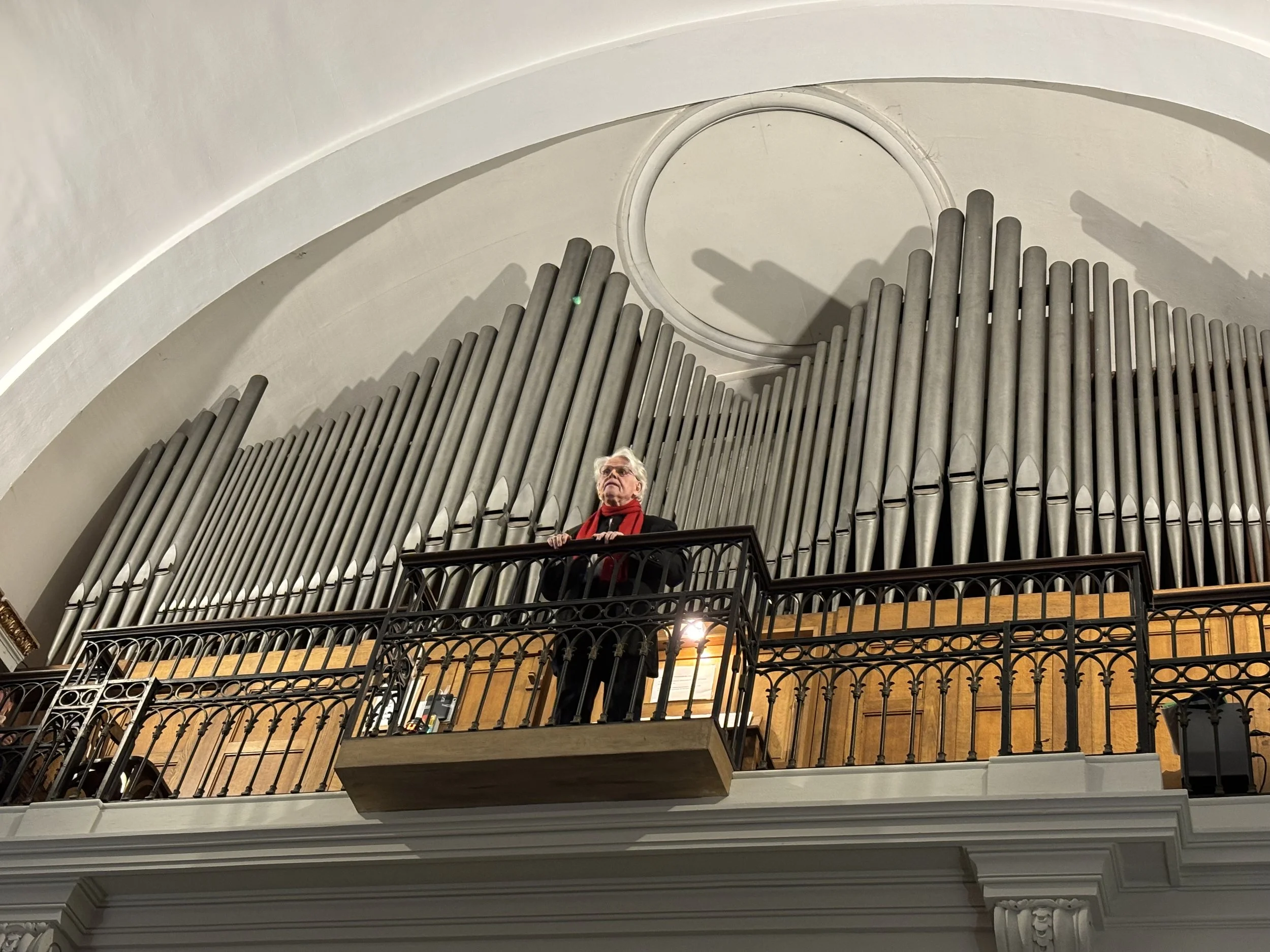 Une femme âgée avec des cheveux gris portant un foulard rouge se tient sur une plateforme au-dessus d'une salle de concert, devant une grande pipe d'orgue dans une architecture intérieure classique.